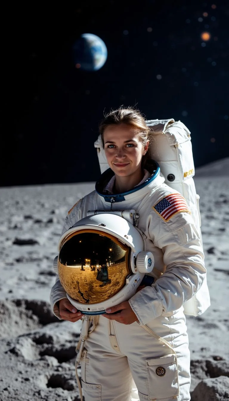 "Yo como astronauta en la Luna, vistiendo un traje espacial de la NASA, sosteniendo mi casco, con la Tierra visible en el cielo estrellado detrás de mí."