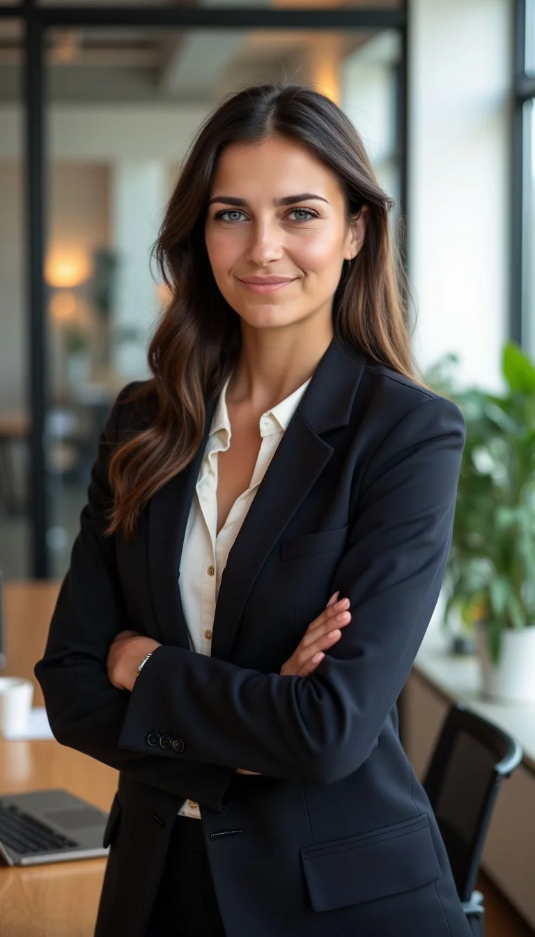 "Yo en una oficina moderna, vistiendo un blazer negro profesional y una blusa blanca, con los brazos cruzados, sonriendo con confianza, con un espacio de trabajo brillante y elegante de fondo."
