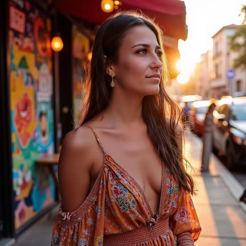 "Yo caminando en una ciudad al atardecer, vistiendo un vestido bohemio floral, pendientes dorados y bañada en una cálida luz dorada."