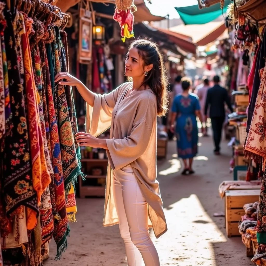 "Foto de viaje de mí explorando un colorido mercado en Marrakech, vistiendo una túnica ligera, pantalones blancos y sandalias, tocando telas coloridas"