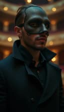 "halloween latin american man in a phantom mask at an eerie opera house"