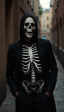 "halloween black man in a skeleton costume in a shadowy alleyway"