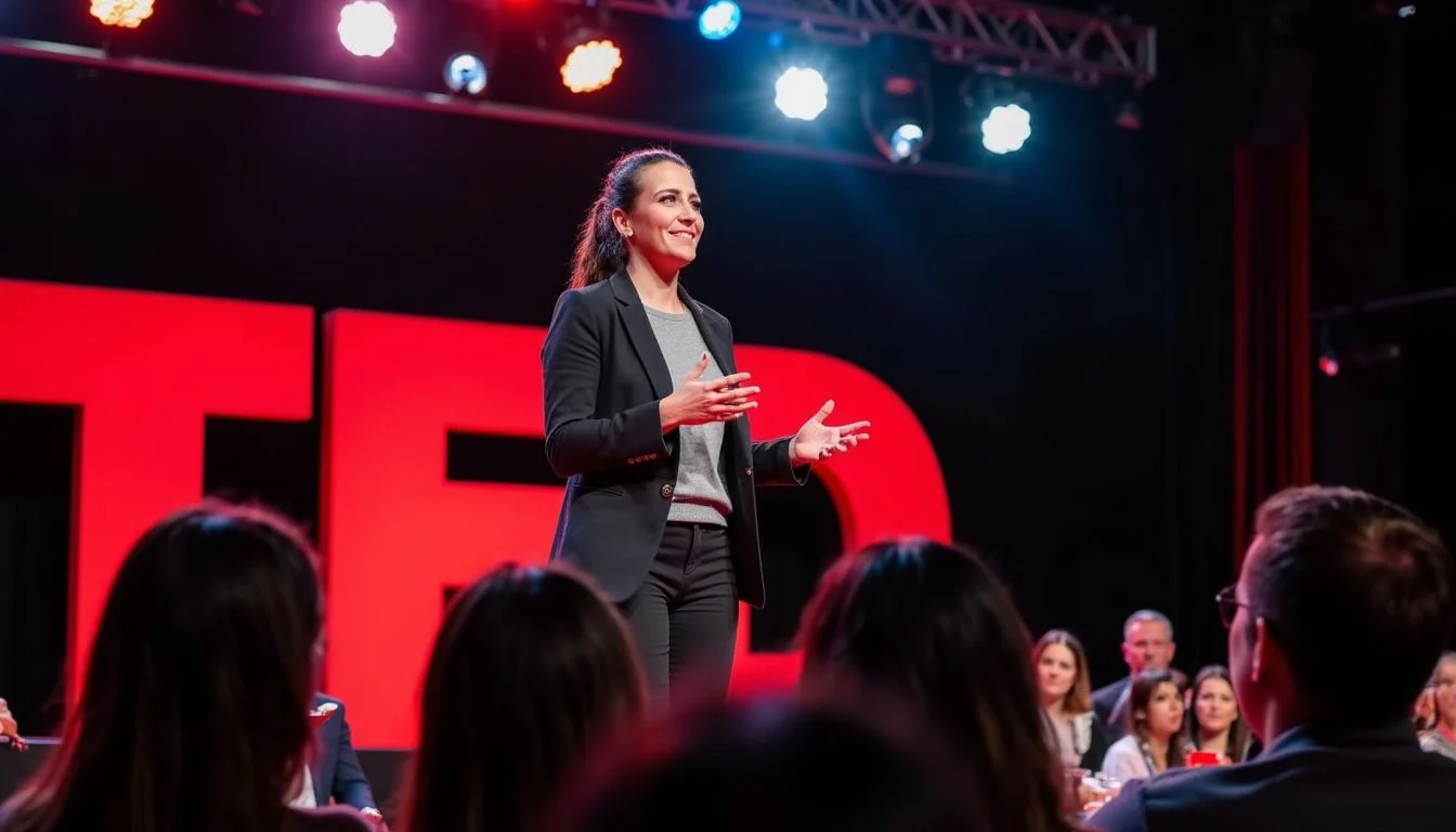 "Io che tengo un TED Talk su un grande palco, indossando un elegante completo, parlando con sicurezza a un vasto pubblico, con il logo rosso TED alle mie spalle e le luci del palco che illuminano la scena."